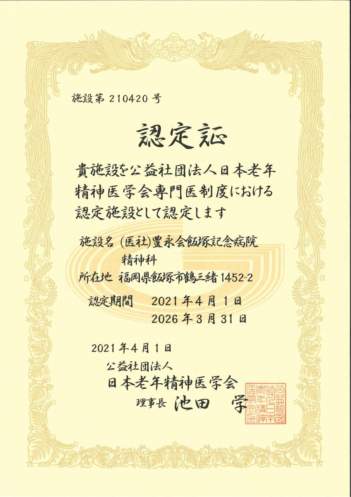 | 認定施設 | 日本精神神経学会精神科専門医制度における研修施設 日本精神科救急学会暫定認定施設 日本精神科病院協会が行う病院標準評価体系の自己評価(セルフレビュー)認定施設 日本老年精神医学会専門医制度における認定施設 日本腎臓学会における研修施設認定 日本高血圧学会専門医制度における認定施設 日本透析医学会教育関連施設認定証 |